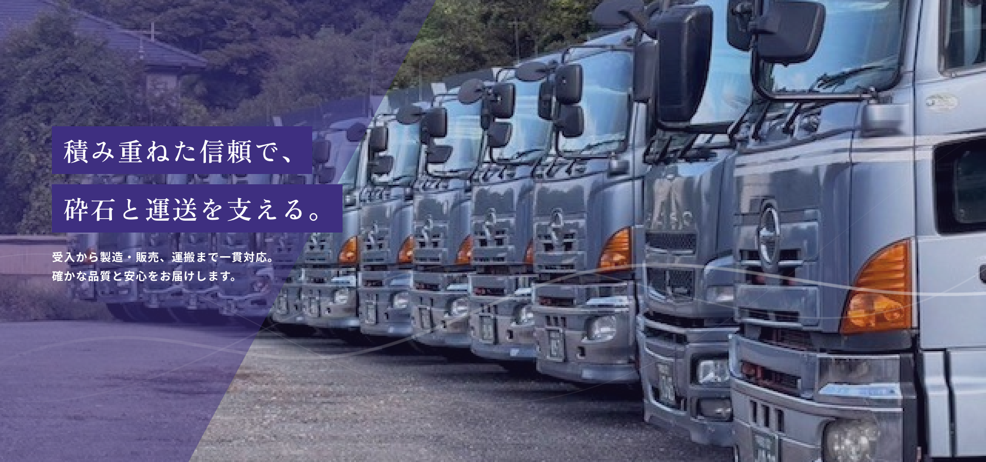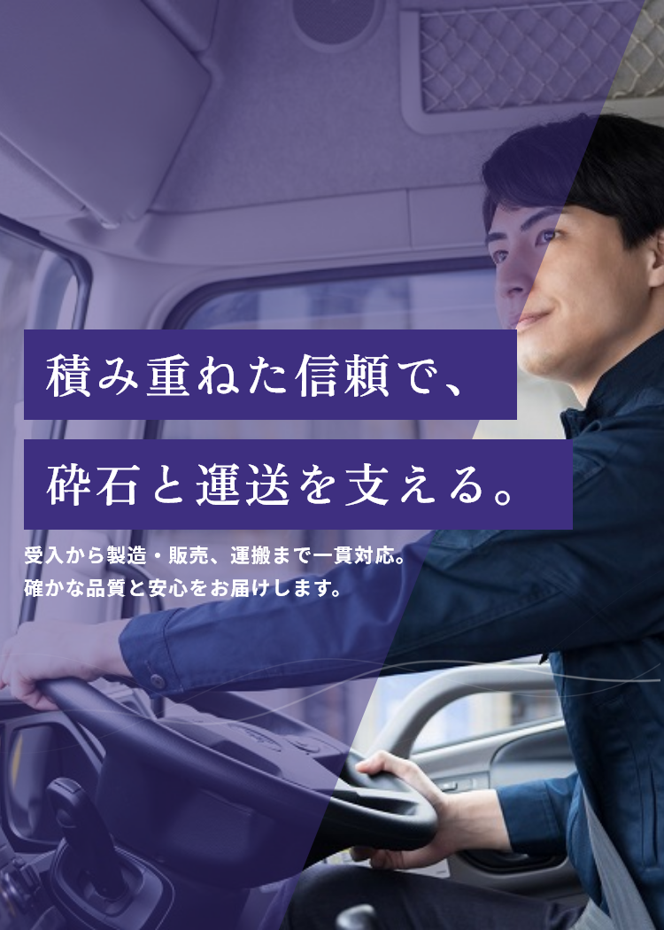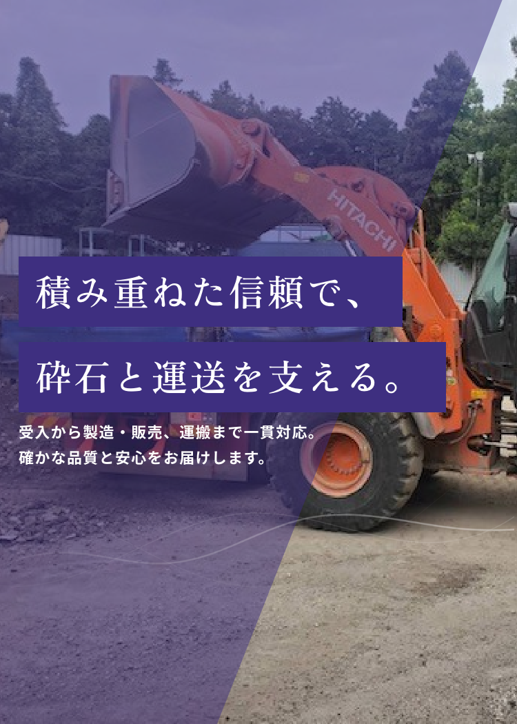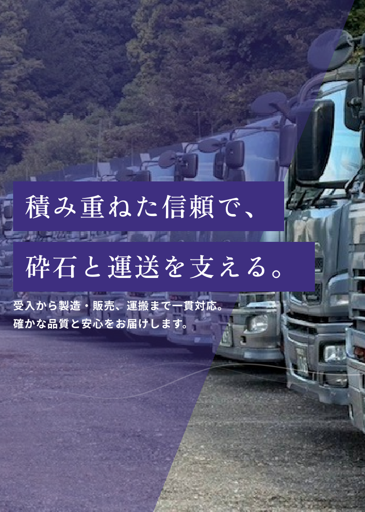 砕石事業では、資源を有効活用しながら安定した品質を提供し、運送事業では安全かつ迅速な輸送でお客様のニーズに応えております。 これからも「確かな品質」と「誠実な対応」を礎に、地域社会に貢献し、信頼され続ける企業を目指してまいります。